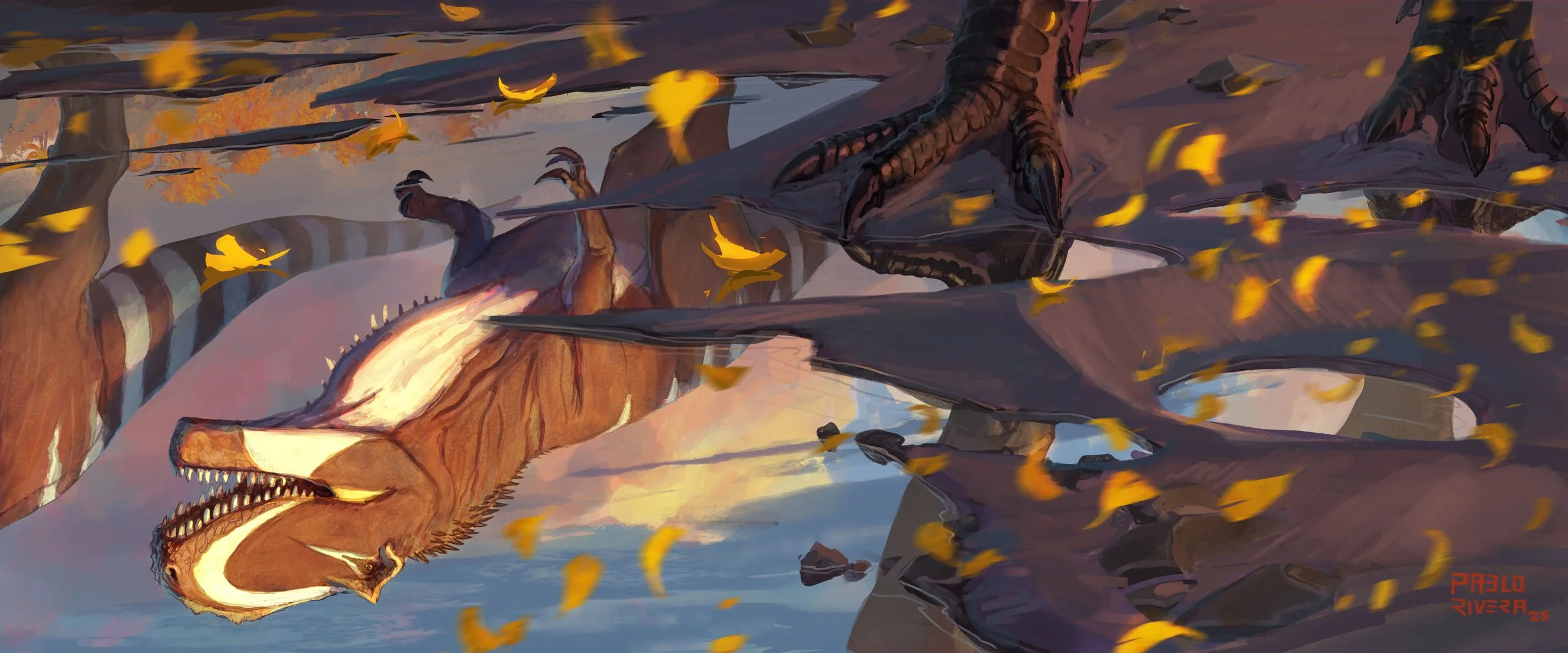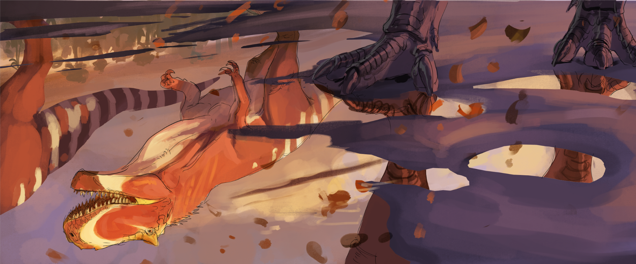 Early exploratory sketches- I knew I wanted something that felt “majestic” but also that differed from just a painting of a dinosaur in an environment just walking by. I kept working through the idea of some kind of unique framing, ultimately being inspired by a landscape piece by Forrest Dickison to really have this piece be all about the reflection of a Giganotosaurus, with only the feet of the animal actually visible in-frame.