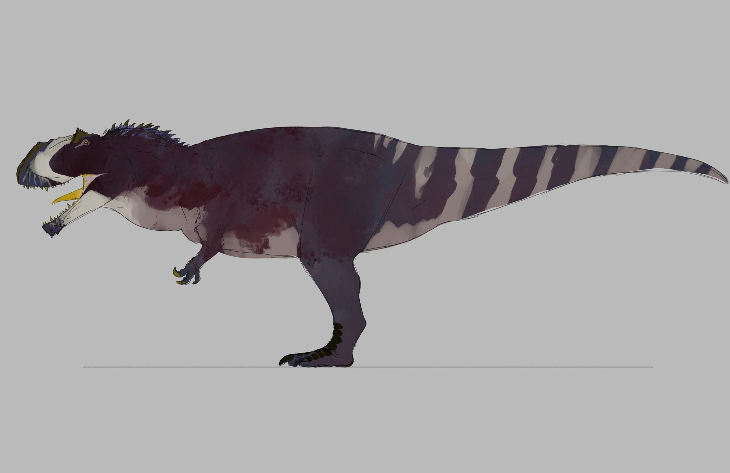 Final blender render and composition- as this was a painting I only began with a very loose thumbnail, a lot of time was spent building up from that idea in 3D. This is very different compositionally from the initial sketch, but the key elements (reflection, upshot view) are there, just refined with additional information. Close relatives of Giganotosaurus were seemingly social, and I wanted to depict a group venturing out early in the morning, with the focus on their reflections.