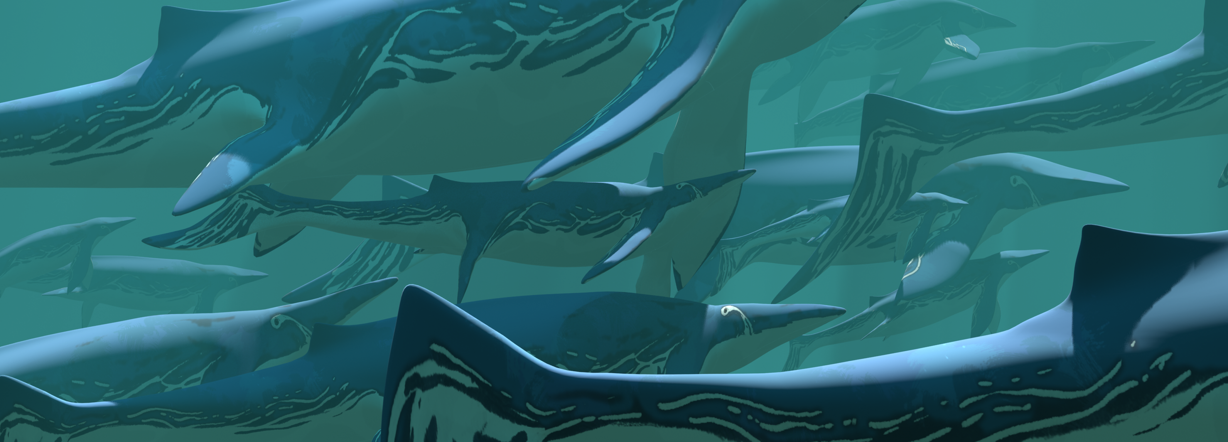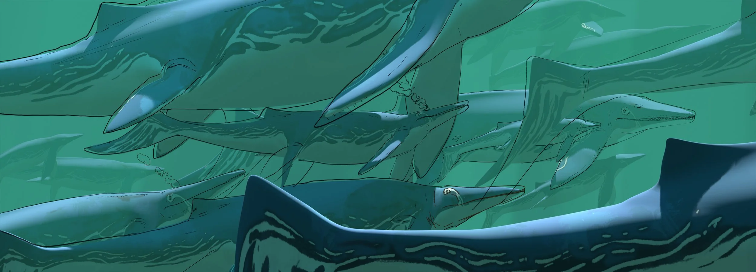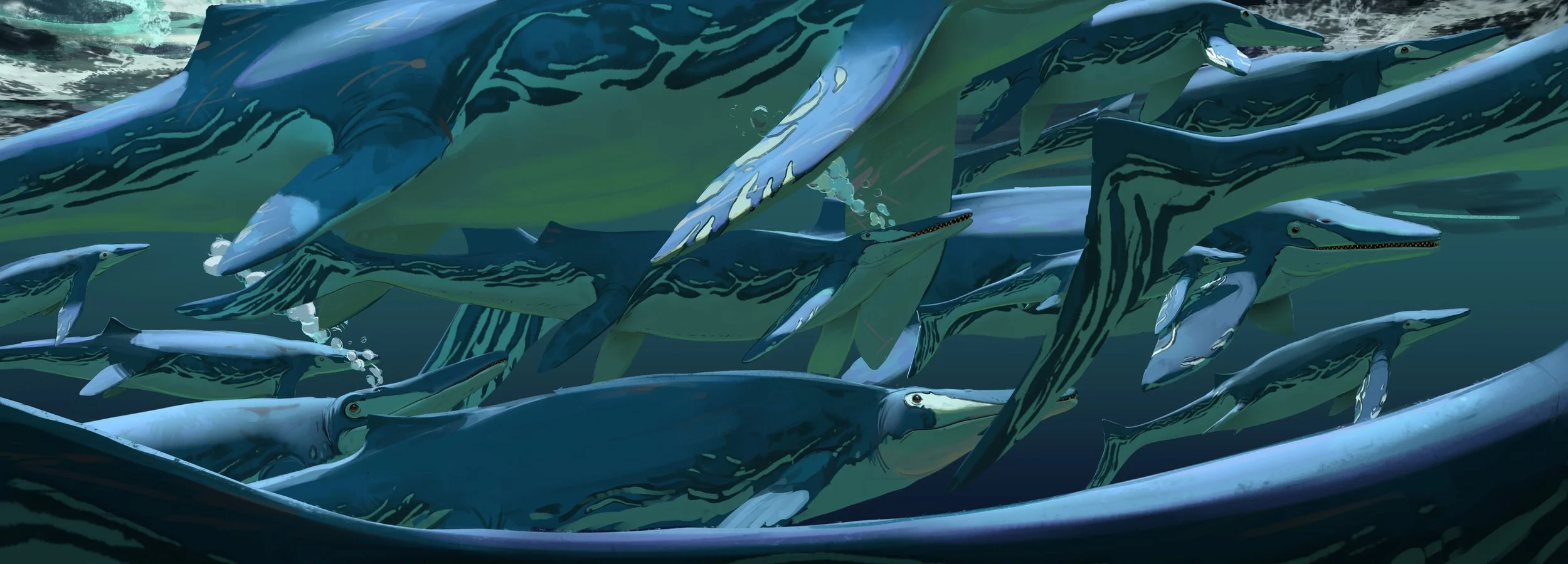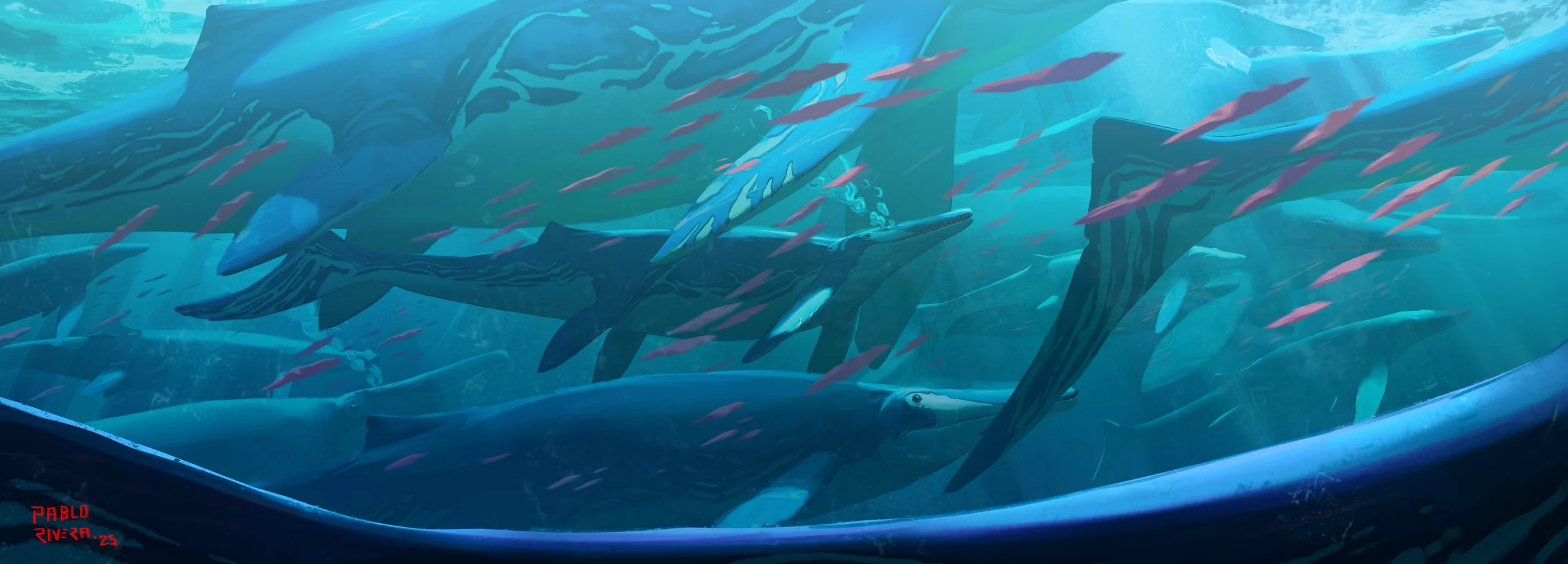 Painting depicting a group of mothers and newborns of the giant marine reptile, Ichytotitan severnensis. The scene is based on fossil beds from Nevada that show how a close relative, Shonisaurus popularis, would regularly migrate to the same shallow oceans to give birth. This was also a piece where I explored a method of more directly integrating a model from blender directly into the painting process, and I have some steps and a video of the model included below.